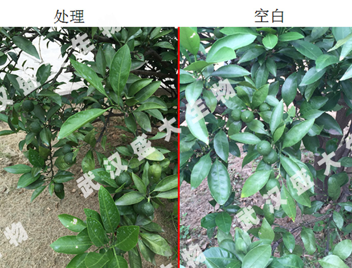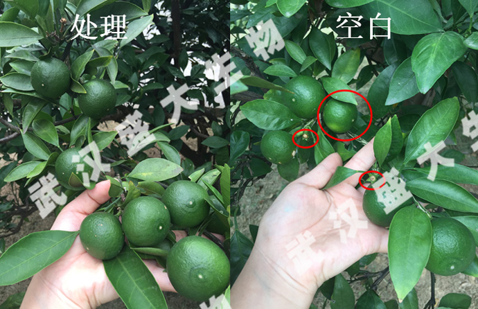 結論:在柑橘幼果期至膨果期葉面噴施“鈴丹”(稀釋800倍)+“霍元鉀”果蔬型(稀釋1000倍),可明顯促進柑橘果實膨大,提高果實光澤度,減少落果,改善葉片黃化。