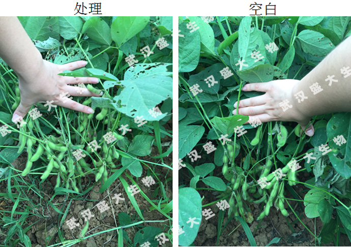 盛大生物研發(fā)部于5月27日在大豆上施用“螯合鐵”,改善作物鐵營(yíng)養(yǎng)和促增產(chǎn)效果明顯。于大豆苗期進(jìn)行“螯合鐵”的葉面噴施,2小袋/畝,噴施3次,間隔 7-10天,效果如下:1、大豆上葉面噴施“螯合鐵”后,大豆缺鐵癥狀得到緩解,新葉葉片顏色由黃綠色向綠色轉(zhuǎn)變(圖1)。說(shuō)明對(duì)缺鐵大豆進(jìn)行“螯合鐵” 葉面噴施后,可有效改善大豆缺鐵癥狀。2、大豆上葉面噴施三次“螯合鐵”后,大豆的莢果多、籽粒飽滿、葉片正常、無(wú)枯死葉片 ,產(chǎn)量得到明顯提高(圖2)。 3、調(diào)查數(shù)據(jù)顯示,“螯合鐵”處理20個(gè)莢果鮮重達(dá)到36.35g,比空白增產(chǎn)24.5%;20個(gè)莢果的籽粒鮮重達(dá)到19.68g,比空白處理增產(chǎn) 16.2%。