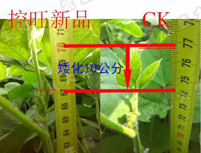 試驗(yàn)結(jié)果證明,該控旺新品可控制大豆等結(jié)莢類作物旺長,明顯降低大豆株高,促進(jìn)其生殖生長,使用安全,后期大豆結(jié)莢多,莢果飽滿,空癟粒少。